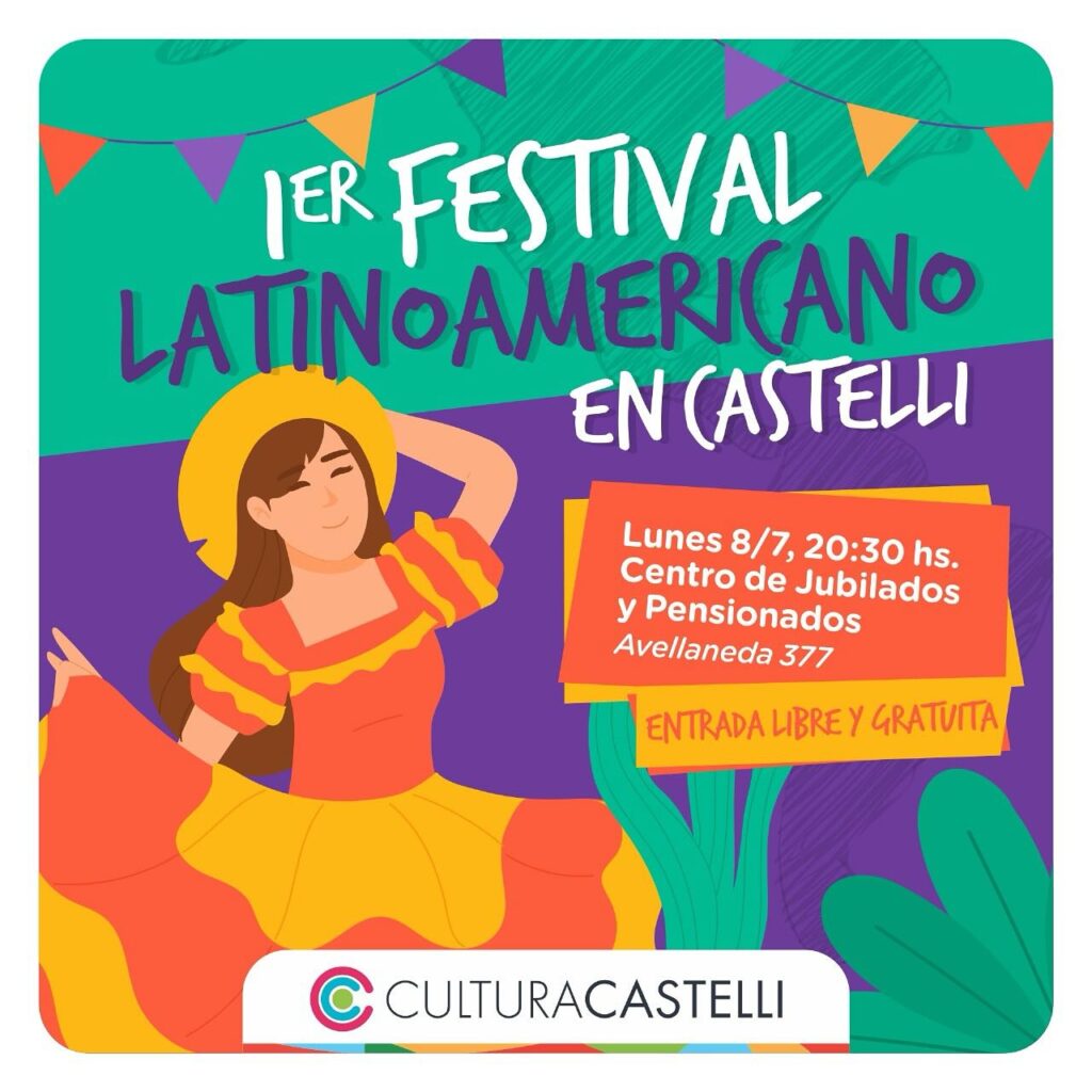 Se llevará a cabo el 1er Festival Latinoamericano en Castelli, el lunes 8 de julio, a las 20:30 hs en el Centro de Jubilados y Pensionados (Avellaneda 377). Entrada libre y gratuita