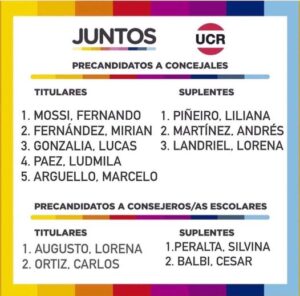 Concejales titulares: Iriarte Jose Luis Barrio Rosa Mabel Forte Nicolas Costa Griselda Cazes Luis Concejales suplentes: Amarillo...
