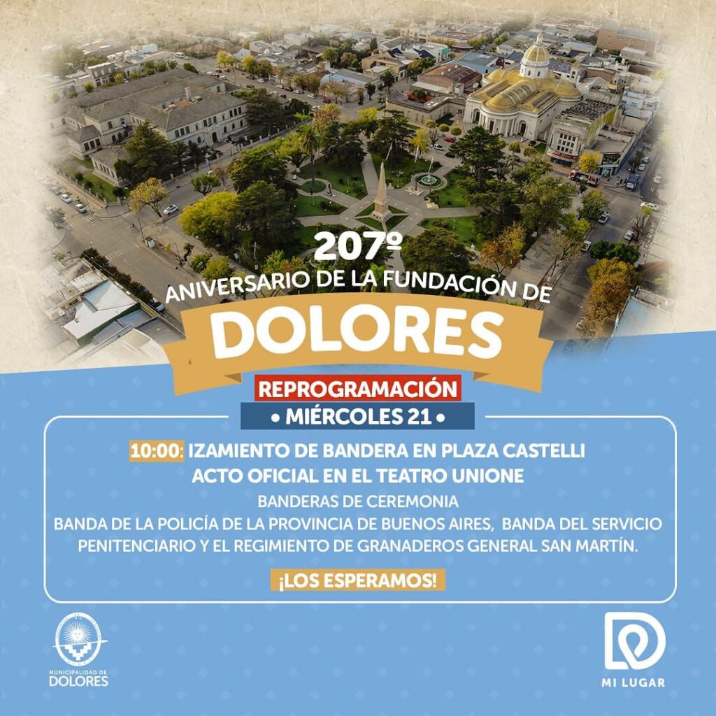 Por cuestiones climáticas se reprogramaron los festejos del miércoles 21 de agosto por el 207º Aniversario de la Fundación de Dolores, organizados por la Municipalidad.