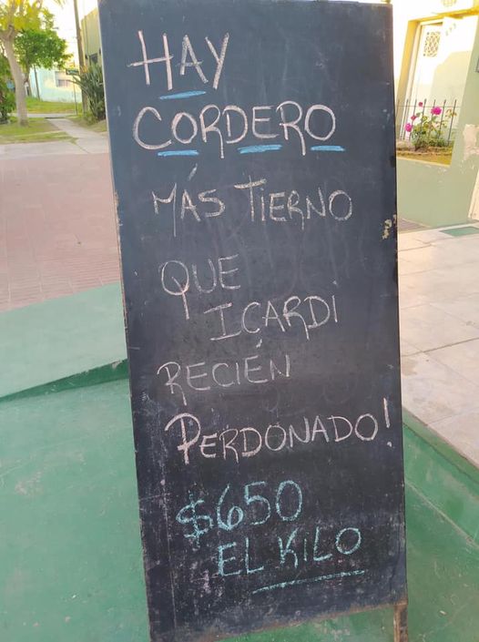 Un comercio de Castelli, no perdió la posibilidad para ofrecer un producto bajo la frase “Hay cordero más tierno que Icardi recién perdonado”