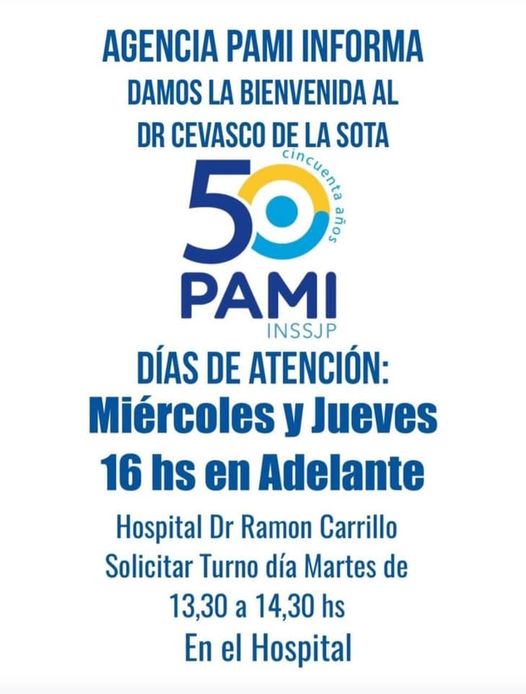 La Agencia Castelli informó que desde esta semana el Dr. Cevasco De La Sota, nuevo médico de cabecera de PAMI, atenderá miércoles y jueves desde las 16hs en consultorios del Hospital Dr. Ramón Carrillo.