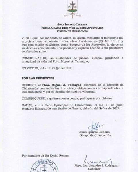 Monseñor Juan Ignacio Liébana designó al Pbro. Miguel Ángel Tamagno, exorcista de la Diócesis de Chascomús.