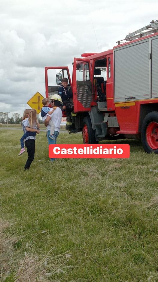 Un integrante de Bomberos Voluntarios Castelli prestó su casco para que un padre cambie un momento de angustia a una sonrisa.