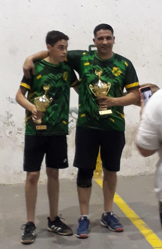 Se trata de Juan Manuel y su papá Marcelo Miranda quienes se consagraron campeones bonaerenses de 3ra categoría de Pelota Paleta desarrollado en la ciudad.