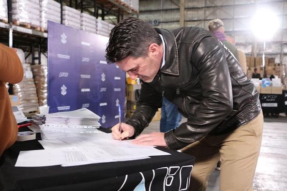 Sebastián Echarren, Jefe de Gabinete, firmó el recibo de la donación de 15 millones de pesos en iluminaria LED.