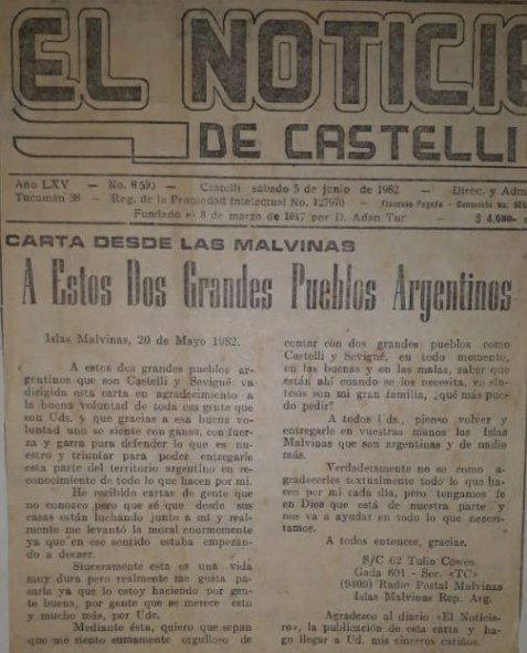 Tulio Alberto Cowes estaba en su casa de Castelli cuando se enteró. Después de 14 meses de servicio, le faltaban 5 días para terminar el servicio militar obligatorio que hacía en el Grupo de Artillería de Defensa Aérea 601 de la estación Camet. Le avisaron que tenía que ir, le dieron tiempo para despedirse de su familia y el 12 de abril llegó a las Islas Malvinas. Su tarea fue defender la pista del aeropuerto en Puerto Argentino del ataque enemigo junto a otros seis soldados.
