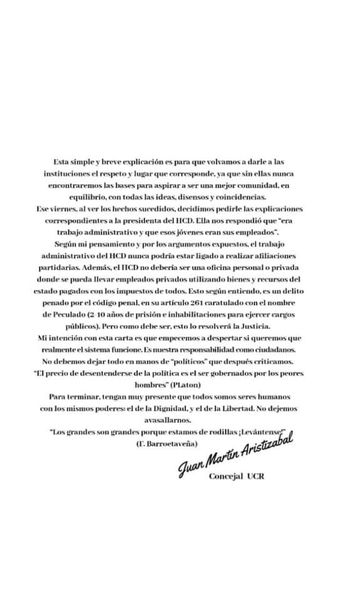 Comunicado del Concejal Juan Martín Aristizabal de la Unión Cívica Radical.