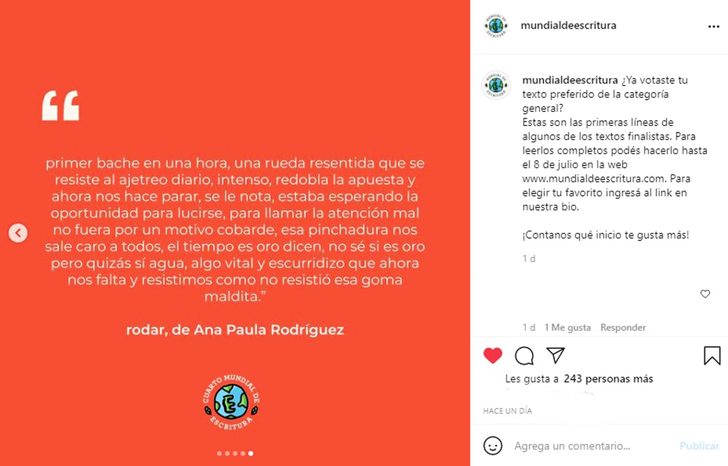 “Día a día tenes que subir tu cuento y lo compartís con tus compañeros (…) Finalizada esa semana se elige 1 y lo envías a la organización y de ahí comienza la instancia de selección del jurado”