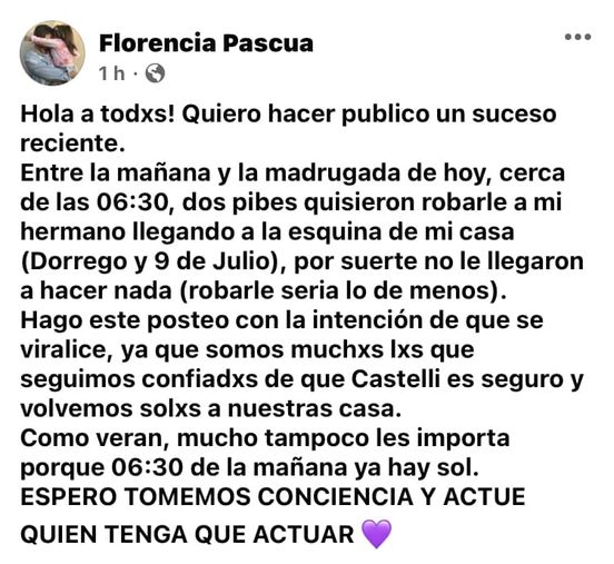 Una vecina, señaló por redes sociales que esta madrugada intentaron robarle a su hermano.